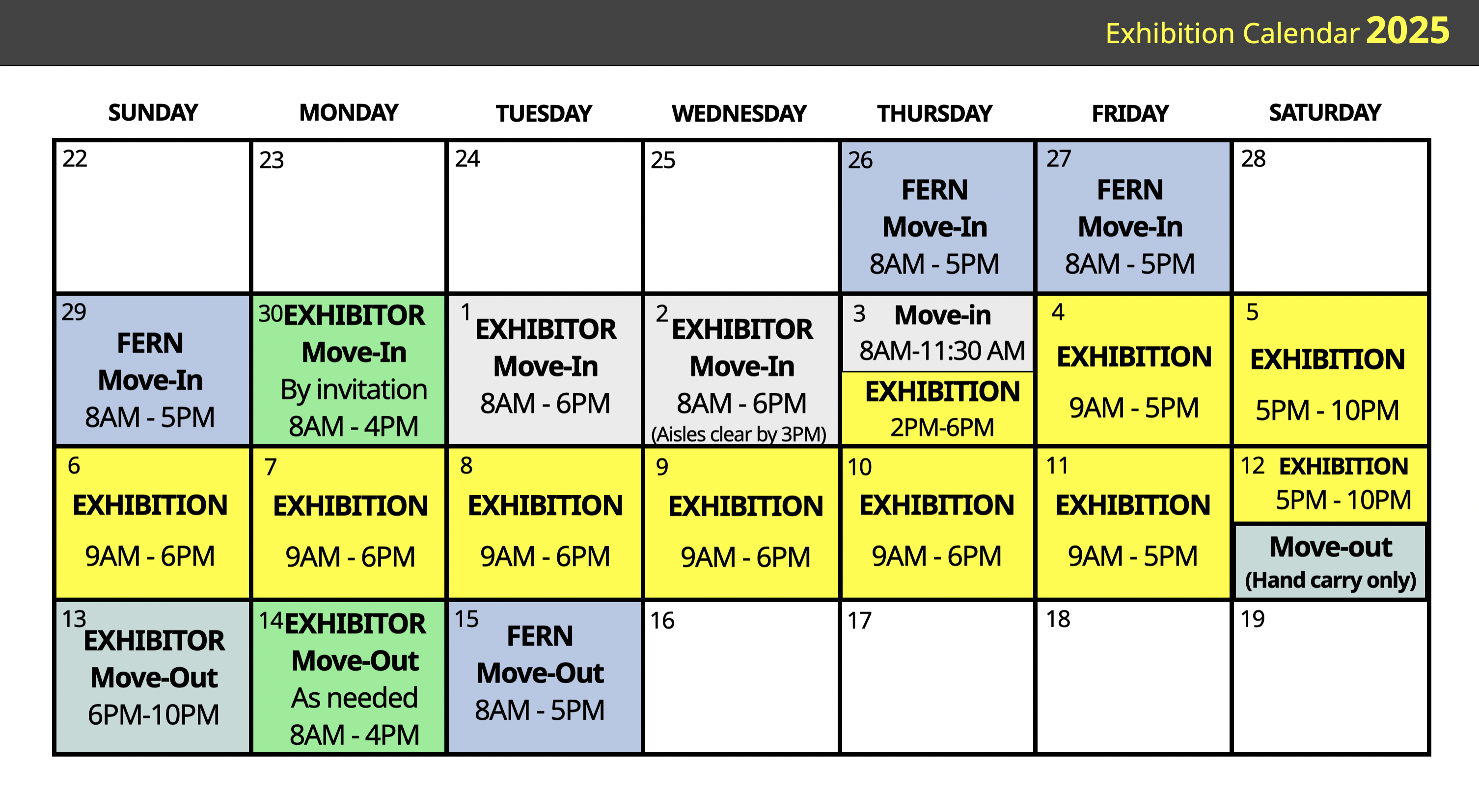 • Revise los horarios de exhibición, montaje y desmontaje para cada día (abajo).